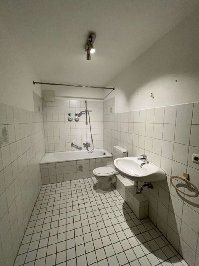 Das innenliegende Badezimmer ist zeitlos weiß gefliest und mit einer Badewanne ausgestattet.