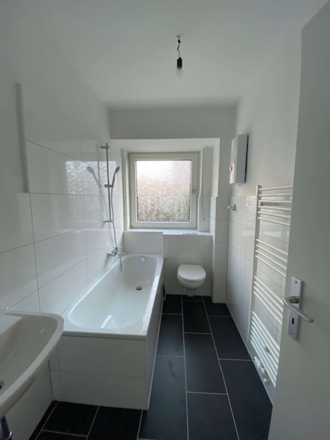 - saniertes Tageslichtbadezimmer mit Wanne und geschmackvollen Wand- und Bodenfliesen,
