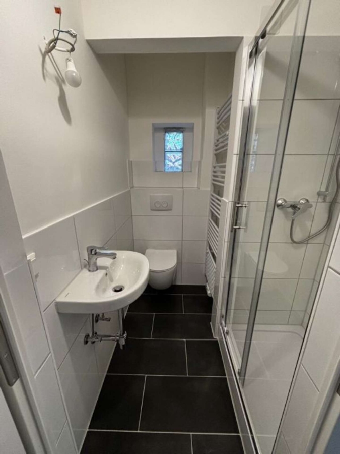 Das Badezimmer ist weiß gefliest und mit einer Dusche, einer Toilette sowie einem Waschbecken ausgestattet.
