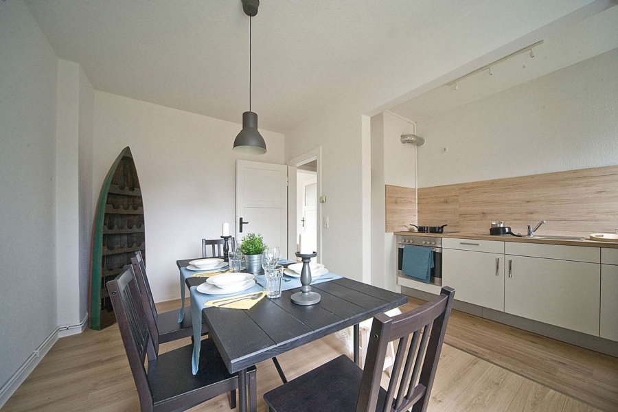 Diese Wohnung verfügt über ein hell und freundlich gefliestes Tageslichtbad mit Badewanne. Alle Wohnräume sind mit weißer Raufasertapete versehen und mit hochwertigem Laminat ausgestattet. In der großzügig geschnittenen Küche haben Sie ausreichend Platz, um einen gemütlichen Essbereich einzurichten. Eine attraktive Einbauküche mit Elektroherd und Backofen ist bereits vorhanden. Die Gasetagenheizung sorgt für angenehme Wärme.