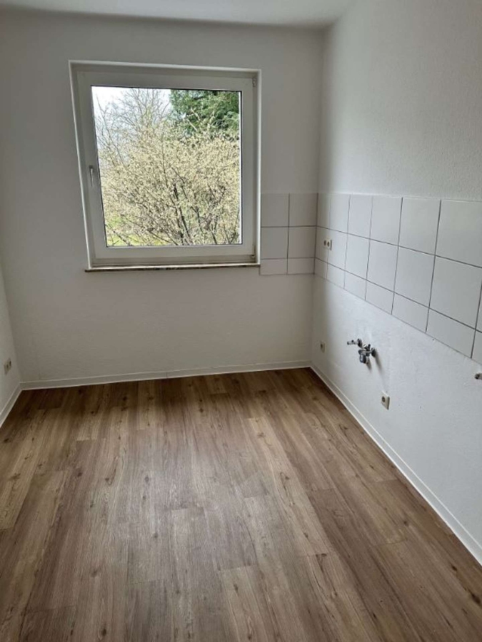Die Küche ist mit einem weißen Fliesenspiegel ausgestattet. Zudem sind alle erforderlichen Anschlüsse vorhanden.