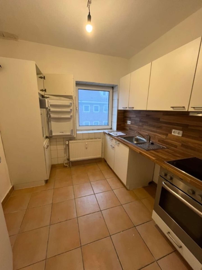 Die Wohnung verfügt über eine funktionale Einbauküche mit weißen Fronten, einer dunkelbraunen Arbeitsplatte und passendem Spritzschutz. Zur Ausstattung gehören ein Kühlschrank sowie ein Cerankochfeld mit Backofen. Das Badezimmer ist hell gefliest, mit einem Fenster ausgestattet und verfügt über eine Badewanne. Insgesamt bietet die Ausstattung eine solide Basis für ein angenehmes Wohnen und eignet sich ideal für Singles, Paare oder kleine Haushalte. Ein Kellerabteil steht zusätzlich zur Verfügung und bietet praktischen Stauraum. Für komfortables Ankommen im Alltag sorgt die vorhandene Gegensprechanlage.