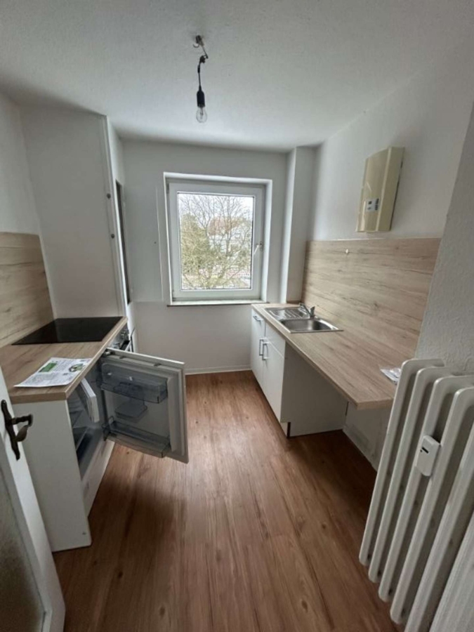 Die freundliche Einbauküche ist mit weißen Fronten, einer Holzarbeitsplatte sowie einem passenden Spritzschutz auf beiden Seiten ausgestattet. Sie verfügt über zwei Unterzeilen, einen Backofen und ein Cerankochfeld, sowie einem Kühlschrank. Zudem sind Anschluss und Stellplatz für eine Waschmaschine vorhanden – praktisch und komfortabel im Alltag.