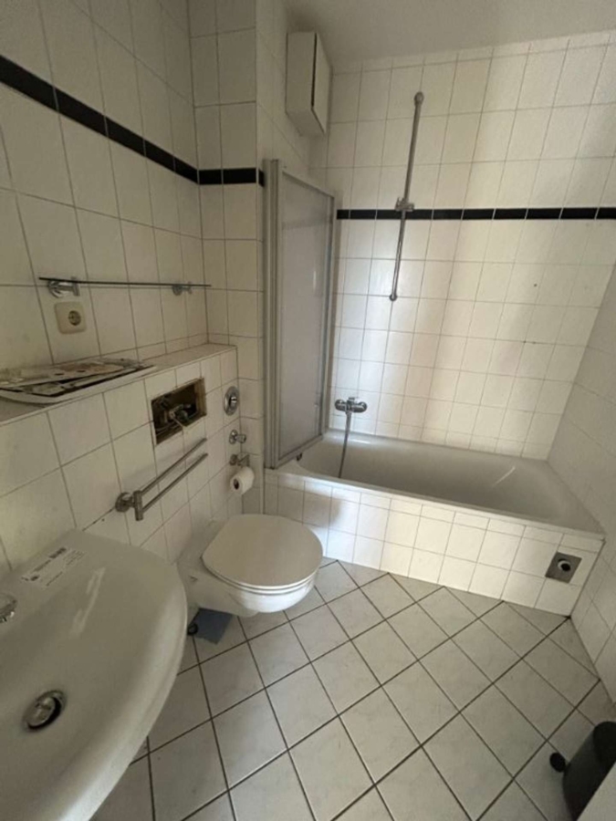 Das Badezimmer ist vollständig weiß gefliest und verfügt über eine Badewanne mit integrierter Duschwand, ein WC, ein Waschbecken sowie einen Anschluss für eine Waschmaschine.