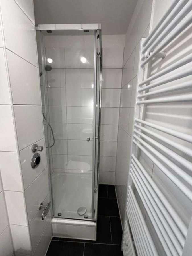 Das Badezimmer ist weiß gefliest und mit einer Dusche, einer Toilette sowie einem Waschbecken ausgestattet.