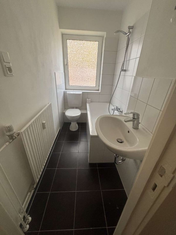 Das helle Badezimmer verfügt über eine klassische Badewanne – ideal für entspannte Stunden. Ein Fenster sorgt für Tageslicht und gute Belüftung.