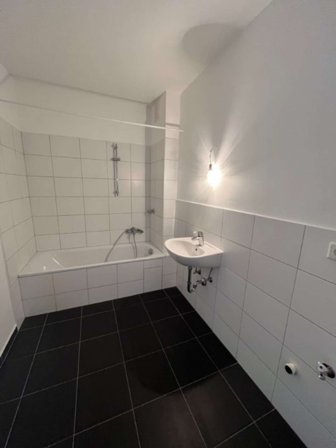 Das moderne Badezimmer ist mit einer Badewanne, einem separaten WC, dunklen Bodenfliesen sowie zeitlosen weißen Wandfliesen ausgestattet. Der Waschmaschinenanschluss befindet sich im Badezimmer.