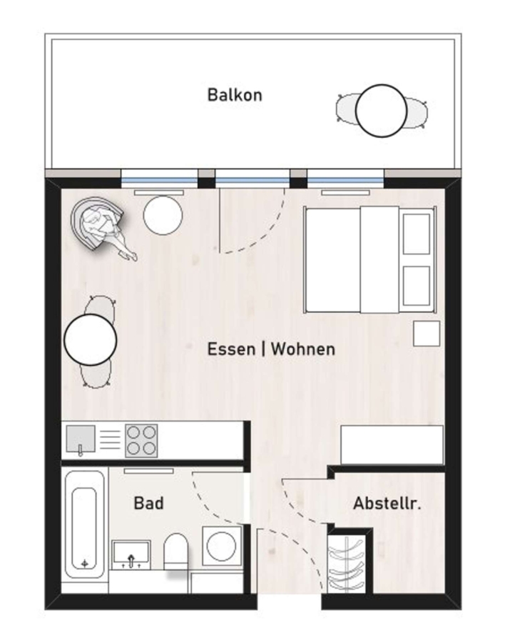 Die ruhige 1-Zimmer-Wohnung mit Balkon liegt in der 3.Etage. Über einen breiten Eingangsbereich gelangt man zum großen Wohn- und Essbereich, welcher an die offene Küche angrenzt. Die Einbauküche verfügt über einen eingebauten Kühlschrank, Herd, Ofen, Spüle und Spülmaschine sowie genug Stauraum in den Schränken und Schubladen. Der helle, große Balkon ist überdacht. Angrenzend zum Flur befindet sich ein Abstellraum. Gegenüber dem Abstellraum befindet sich ein großzügiges, modernes Bad samt Badewanne, Waschmaschienenanschluß und Handtuchheizung.